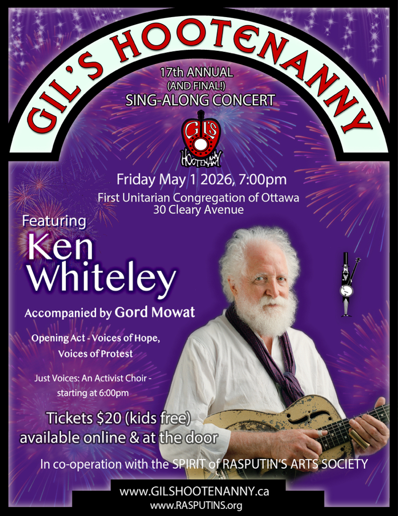 Gil’s Hootenanny will take place at 7:00 pm, Friday, May 1, at 30 Cleary Avenue, the campus of the First Unitarian Congregation of Ottawa. The venue is accessible, has ample parking and is serviced by OC Transpo.